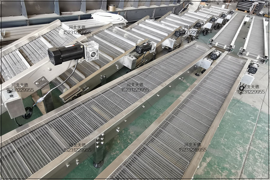 (3)鋼絲網(wǎng)帶 鋼絲網(wǎng)帶強(qiáng)度高,耐高溫。它具有網(wǎng)孔,網(wǎng)孔的大小可按需要選擇,多用于一邊輸送一邊固液分離的場(chǎng)合。如油炸食品爐中的物料輸送,水果洗滌設(shè)備中的水平輸送等常采用鋼絲網(wǎng)帶。鋼絲網(wǎng)帶用于烘烤食品設(shè)備中時(shí),由于網(wǎng)帶網(wǎng)孔能透氣,故烘烤時(shí)食品生坯底部水分容易蒸發(fā),其外形不會(huì)因脹發(fā)而變得不規(guī)則或發(fā)生油灘、洼底、粘帶及打滑等現(xiàn)象。網(wǎng)帶上積累的面屑碳黑不易清洗,致使制品底部粘上黑斑而影響食品質(zhì)量。應(yīng)對(duì)網(wǎng)帶涂鍍防粘材料來(lái)解決。